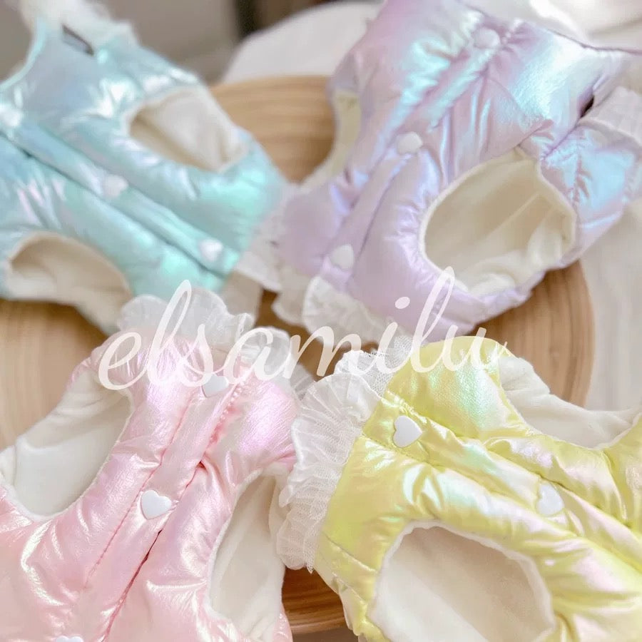 Crafted from soft, glossy quilted fabric adorned with delicate pearls and satin bows, this elegant winter dress brings warmth and grace to your furry princess.